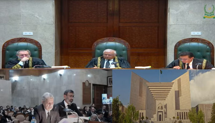 چھبیسویں آئینی ترمیم کے خلاف درخواستوں پر سماعت شروع جسٹس امین الدین کی سربراہی میں 8 رکنی آئینی بینچ کر رہا ہے، بینچ میں جسٹس جمال خان مندوخیل، جسٹس محمد علی مظہر، جسٹس عائشہ ملک، جسٹس حسن اظہر رضوی، جسٹس مسرت ہلالی، جسٹس نعیم افغان اور جسٹس شاہد بلال شامل ہیں۔