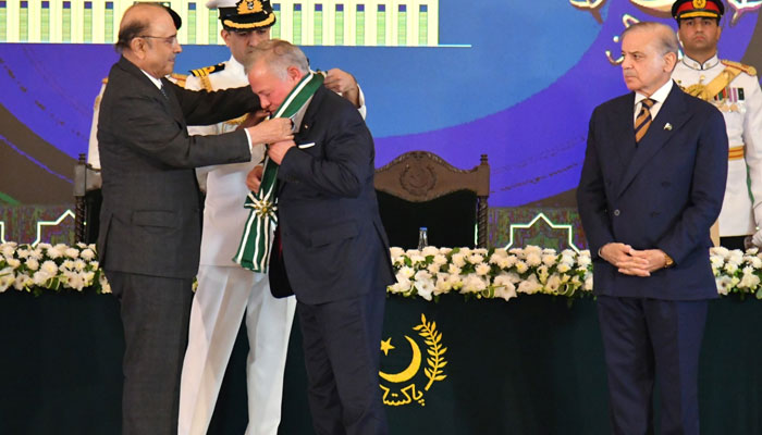 ایوان صدر اسلام آباد میں اردن کے شاہ عبداللہ دوئم کو اعلیٰ ترین سول ایوارڈ دینے کی تقریب ہوئی جس میں دونوں ملکوں کے قومی ترانے بجائے گئے۔ تقریب میں وزیر اعظم شہباز شریف، فیلڈ مارشل سید عاصم منیر، ائیر چیف مارشل ظہیر احمد بابر سدھو اور ایڈمرل نوید اشرف کی بھی نے شرکت کی۔