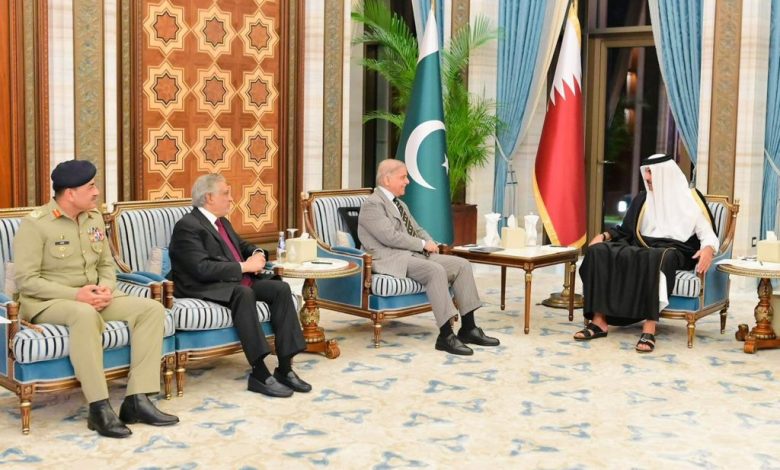 وزیراعظم محمد شہباز شریف اور امیر قطر شیخ تمیم بن حمد الثانی نے پاکستان اور قطر کے درمیان دیرینہ برادرانہ تعلقات کو مزید مضبوط بنانے کیلئے مشترکہ عزم کا اعادہ کرتے ہوئے باہمی دلچسپی کے تمام شعبوں میں تعاون بڑھانے اورمذاکرات، سفارت کاری اور تنازعات کے پرامن حل کی اہمیت پر زور دیا ہے۔منگل کو وزیراعظم آفس کے میڈیا ونگ سے جاری بیان کے مطابق وزیراعظم محمد شہباز شریف نے قطر کے امیر شیخ تمیم بن حمد الثانی سے ملاقات کی،نائب وزیراعظم و وزیر خارجہ اسحاق ڈار اور آرمی چیف و چیف آف ڈیفنس فورسز فیلڈ مارشل سید عاصم منیر بھی ملاقات میں موجود تھے۔دونوں رہنمائوں نے دوطرفہ تعلقات کے تمام پہلوئوں کا جائزہ لیا اور پاکستان اور قطر کے درمیان دیرینہ برادرانہ تعلقات کو مزید مضبوط بنانے کے لیے اپنے مشترکہ عزم کا اعادہ کیا۔ انہوں نے سیاسی رابطوں کے مثبت انداز پر اطمینان کا اظہار کیا اور باہمی دلچسپی کے تمام شعبوں میں تعاون بڑھانے کی اہمیت پر زور دیا۔